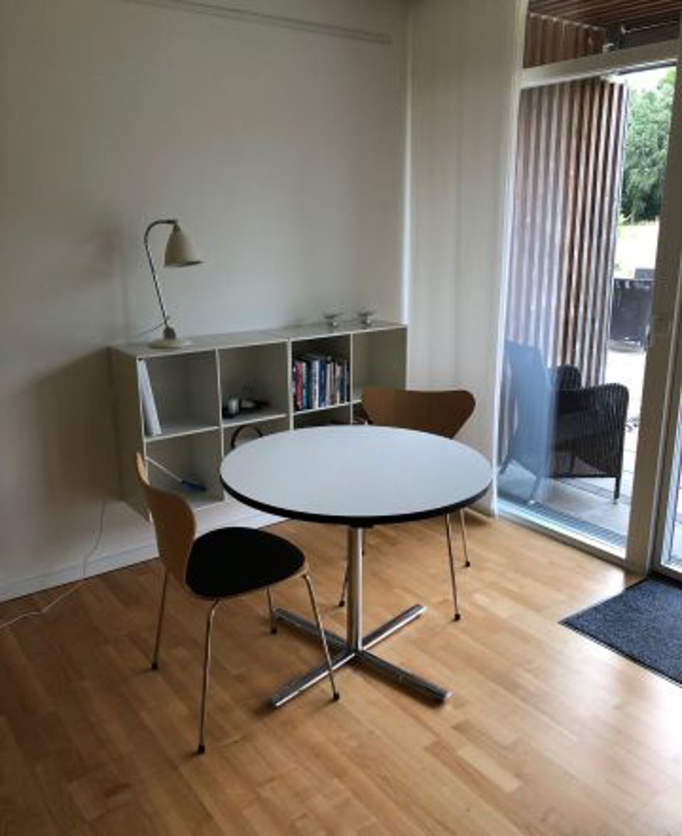 Fra stuen er der udgang til terrasse med udsigt til Egense Ås. På terrassen kan man nyde den friske luft og udsigten enten i havemøblerne, eller i sengen som kan køres derud.