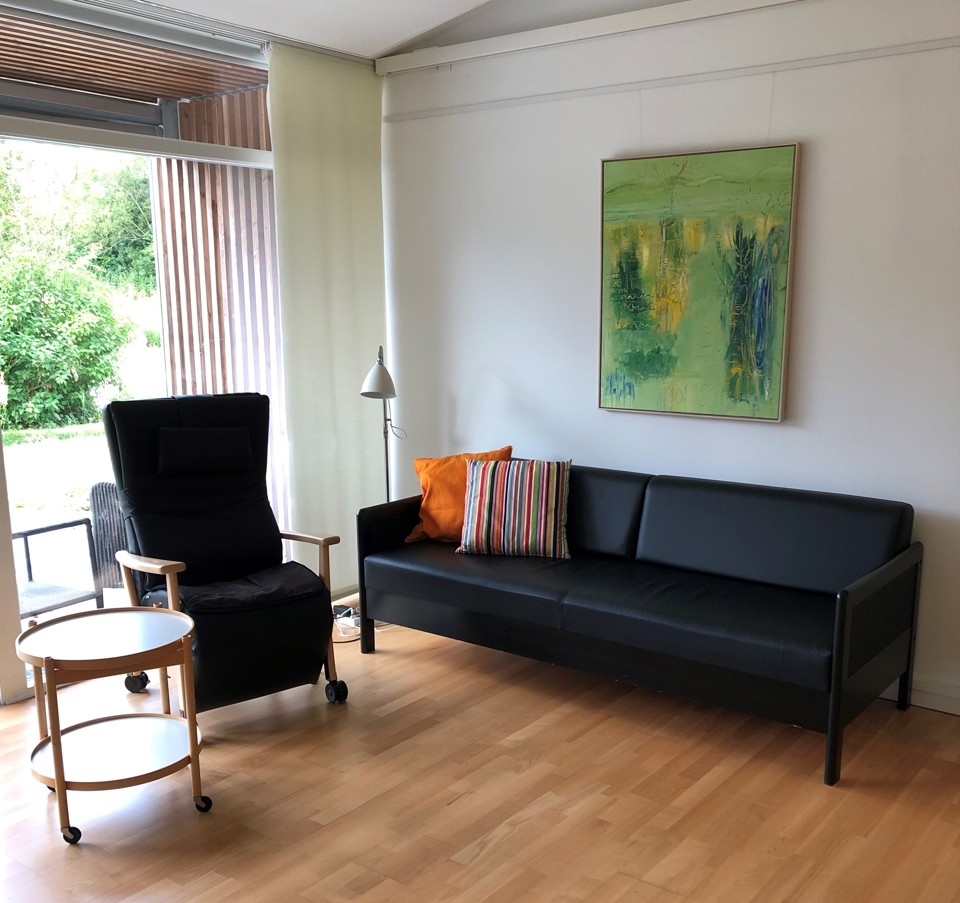 Patientstuen er på 40 m2, incl. stort badeværelse. Der er egen terrasse der er delvis overdækket, med havemøbler og markise.